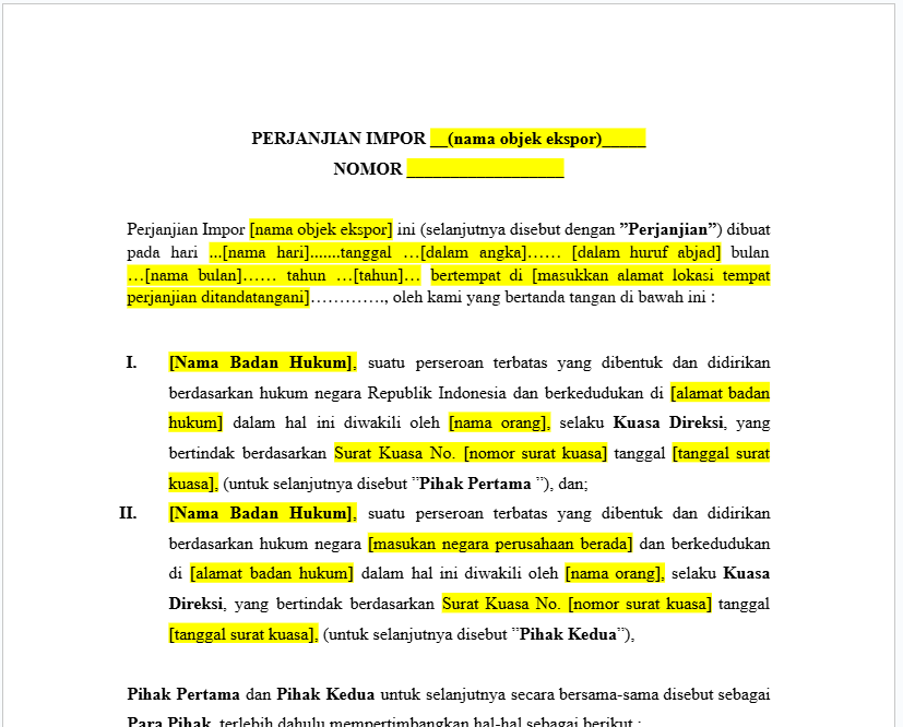 Perjanjian Impor dirancang dengan seksama untuk memberikan kepastian atas hak dan kewajiban para pihak, menetapkan syarat-syarat transaksi secara jelas, dan menjamin proses impor sesuai peraturan hukum dan standar internasional