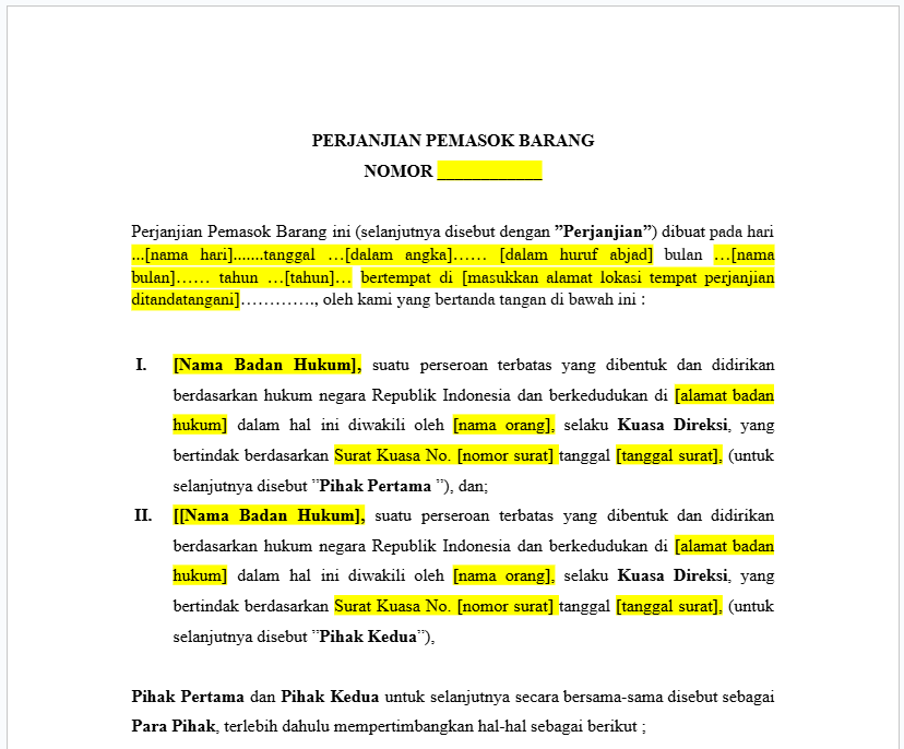 Perjanjian Pemasokan Barang ini disusun dengan cermat untuk menetapkan secara jelas hak dan kewajiban para pihak dalam proses penyediaan dan penerimaan barang. Perjanjian ini memastikan mutu, jumlah, serta waktu penyerahan sesuai yang telah disepakati, sekaligus memberikan kepastian hukum dan perlindungan bagi kedua belah pihak sepanjang kerja sama berlangsung.